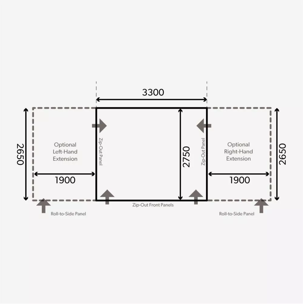 optional erhältliches Front-Vordach, Side Wing und Vorzelterweiterungen