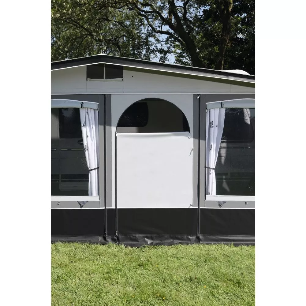 Die Vorderwandteile, betehend aus mehreren Fensterelementen und einem Türelement, sind bliebig gegeneinander tauschbar. So kannst du die Eingangsposition in dein Vorzelt selbst festlegen. Die grossen Fenster lassen viel Licht ins Innere. In Kombination mit den mitgelieferten Gardinen ist für ein angenehmes Wohngefühl gesorgt. Wenn du mal länger unterwegs bist oder keine Blicke ins Innere wünschst, kannst du die Fenster einfach mit den Fensterklappen blickdicht verschliessen. Besonders praktisch und nützlich sind die Fenster-Klappen an Tagen mit schlechterem Wetter. Zudem ist das Caravanvorzelt auf beiden Seiten mit einer praktischen, überdachten Allwetter-Belüftungsöffnung ausgestattet. Das robuste 32,0 x 1,5 mm Stahlrohrgestänge und die Vordachverstärkung gehören ebenfalls zur Serienausstattung.