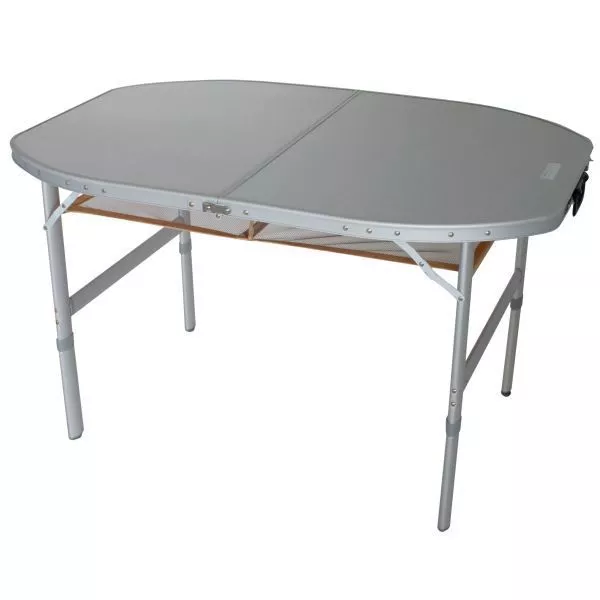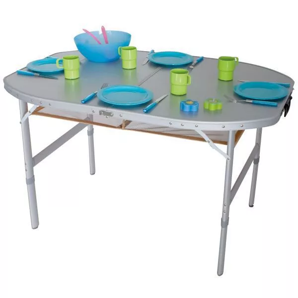 Der Campingtisch Eurotrail Chartres ist ein faltbarer Aluminiumtisch mit wasserdichter Tischplatte. Das Tischbein ist höhenverstellbar. Der Koffertisch verfügt über ein praktisches Ablagenetz unter der Tischplatte.