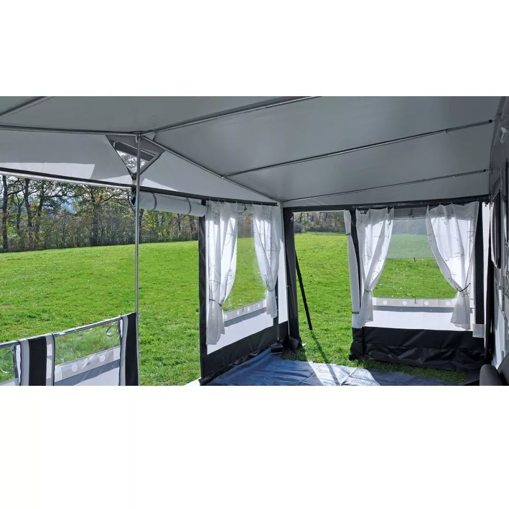Das Wohnwagenvorzelt Hahn Zelte Finnland ist ein grosses Dauerstandvorzelt, bestehend aus robustem PVC-Gewebe. Es ist ideal fürs Ganzjahrescamping geeignet. Mit Tiefe von 280 cm hast du genügend Platz um mit deiner ganzen Familie einen entspannten Urlaub zu geniessen.Das leichte und dennoch starke Ø 25 mm Stahlgestänge (im Lieferumfang enthalten) lässt sich im Nu einziehen, so dass der Urlaub alsbald starten kann. Bei Wunsch kann es optional auch durch ein noch stärkeres Ø 32 mm Stahlgestänge ausgetauscht werden.