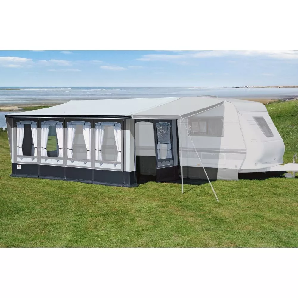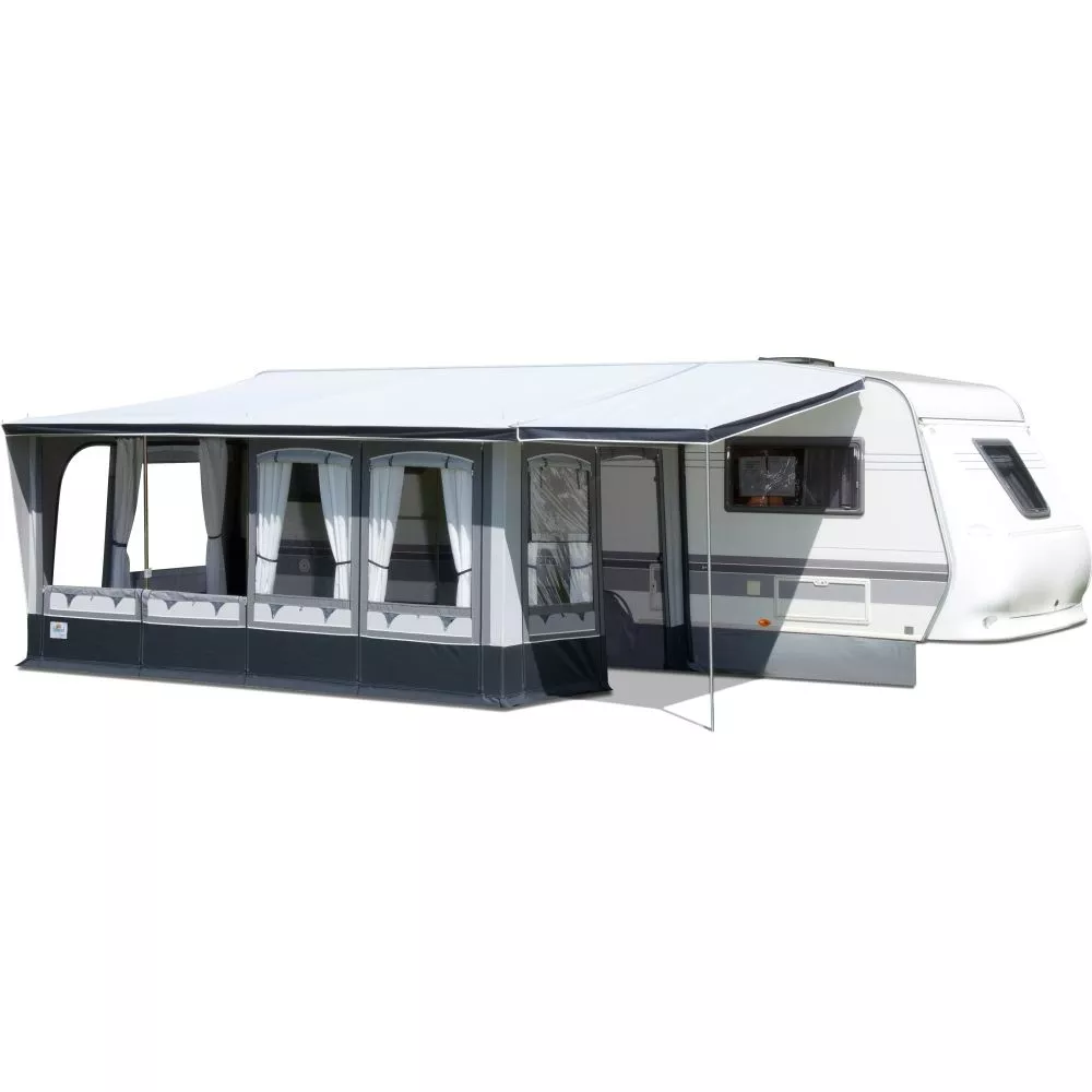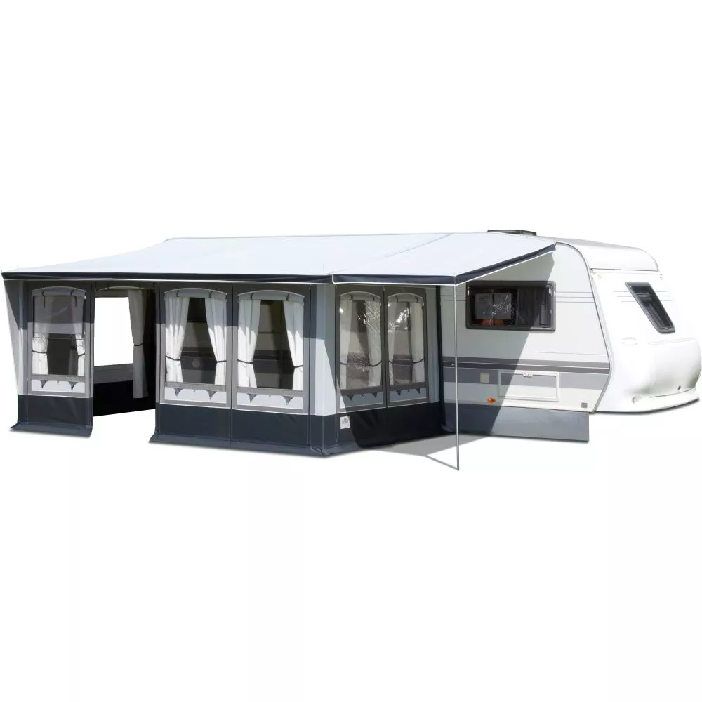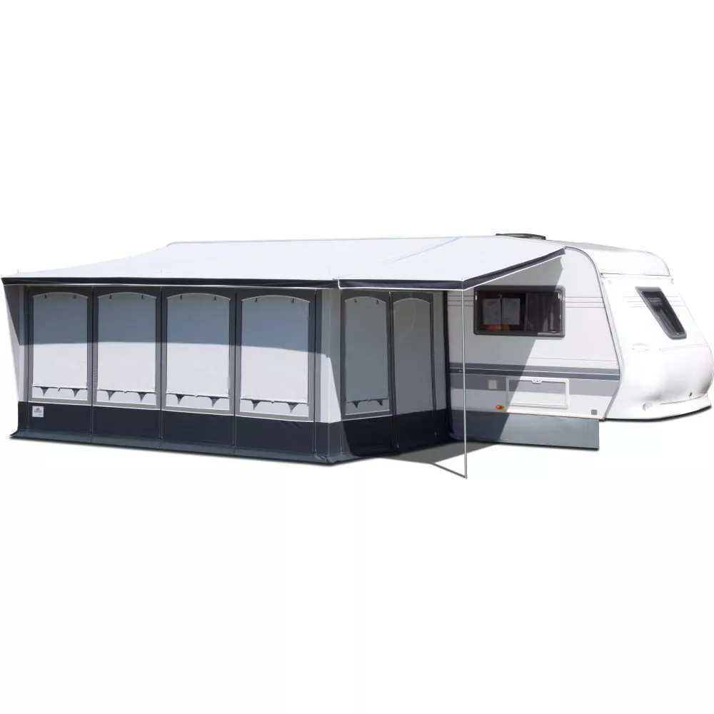 Das Wohnwagenvorzelt brand Forum ist ein Teileinzugszelt mit einem Pultdach aus PVC-Material für höchste Beanspruchungen des Saison- und Ganzjahrescampings. Es ist in sechs Grössen für den rechts- oder linksseitigen Kedereinzug erhältlich. Die Fensterfolien sind geschützt durch Fensterklappen, zwei 3-fach-Fenster regulieren die Lüftung nach Wunsch. Der besondere Clou dieses Wohnwagen-Vorzeltes: Das Türelement und das Fenster-/ Lüftungselement der Seitenwand können gegeneinander und auch mit allen Fensterelementen der Vorderwand getauscht werden. Der dreifache Erdstreifen sorgt für die notwendige Stabilität des Vorzelts und für einen sicheren Bodenabschluss.