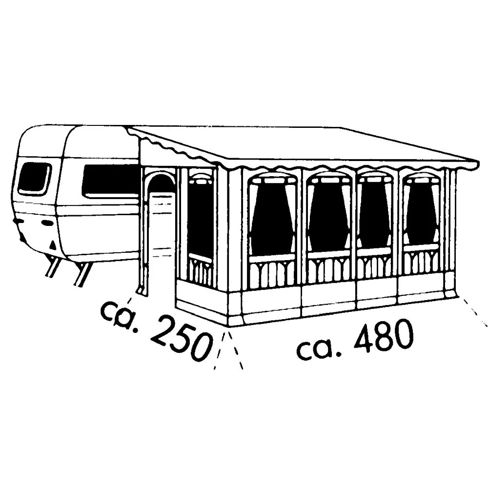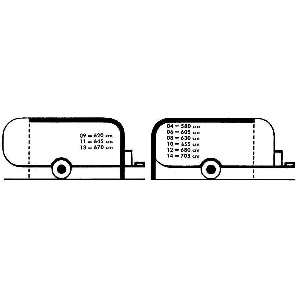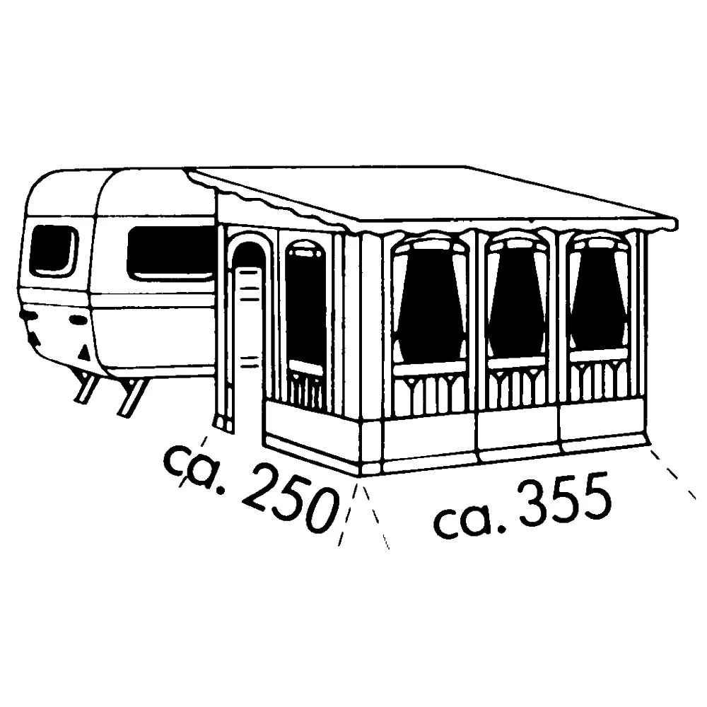 Das Einzugmass ermittelt sich wie folgt: Miss vom Boden durch die Kederschiene bis zu der Stelle am Wohnwagen, an der die Vorzelt-Seitenwand senkrecht an der Wohnwagenwand abschliessen soll (das seitliche Vordach wird nicht berücksichtigt). Eine optimale Passform wird bei einer Kederschienenhöhe von ca. 240 bis 250 cm realisiert.