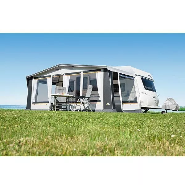 Das Vorzelt dwt Prinz Plus ist für alle Jahreszeiten die richtige Entscheidung. Die attraktive Farbkombination dieses modernen Vorzeltes liegt voll im Trend. Die verarbeiteten Materialen trotzen jedem Wetter, lassen sich leicht reinigen und sind besonders robust. Die innen eingenähten Hohlsäume in den Wänden nehmen Zusatzstangen für mehr Stabilität auf. Die Vorderwand-Segmente lassen sich zu einer Veranda abklappen. Für mehr Platz kannst du beim dwt Prinz Plus auf der rechten Seite einen Erker anbauen.