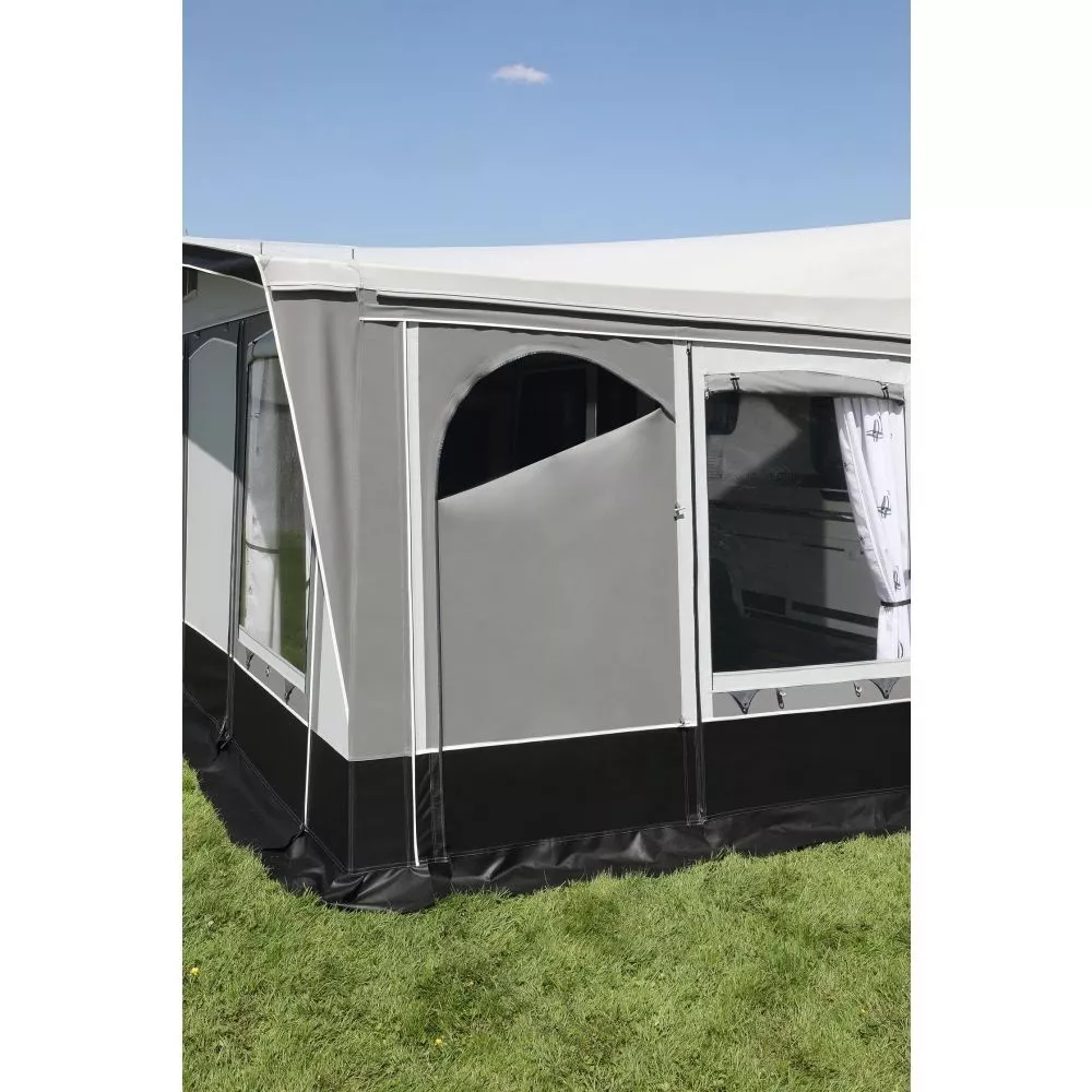 Die Vorderwandteile, betehend aus mehreren Fensterelementen und einem Türelement, sind bliebig gegeneinander tauschbar. So kannst du die Eingangsposition in dein Vorzelt selbst festlegen. Die grossen Fenster lassen viel Licht ins Innere. In Kombination mit den mitgelieferten Gardinen ist für ein angenehmes Wohngefühl gesorgt. Wenn du mal länger unterwegs bist oder keine Blicke ins Innere wünschst, kannst du die Fenster einfach mit den Fensterklappen blickdicht verschliessen. Besonders praktisch und nützlich sind die Fenster-Klappen an Tagen mit schlechterem Wetter. Zudem ist das Caravanvorzelt auf beiden Seiten mit einer praktischen, überdachten Allwetter-Belüftungsöffnung ausgestattet. Das robuste 28,0 x 1,0 mm Stahlrohrgestänge mit PowerGrip-System und Vordachverstärkung gehört ebenfalls zur Serienausstattung.